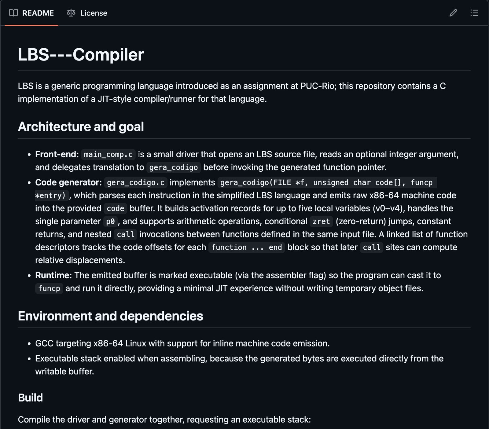 This project began after a university class introduced LBS, a simplified low-level language with Assembly-like abstractions. I implemented a small compiler for LBS that translates sample .txt programs into executable output. Building it helped me understand how programs map to machine-level operations and strengthened fundamentals such as parsing, and core data structures.